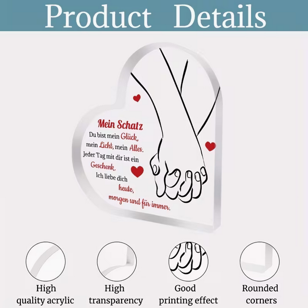 Echte Liebe kennt keine Zeit. Mit dieser klassischen Acryl-Herz-Plakette schenken Sie ein bleibendes Symbol Ihrer Zuneigung. Das schlichte, aber tiefgreifende Design mit dem Spruch „Ich liebe dich – Heute, Morgen, Für Immer.“ ist mehr als nur eine Dekoration – es ist ein tägliches Versprechen an Ihren Lieblingsmenschen.